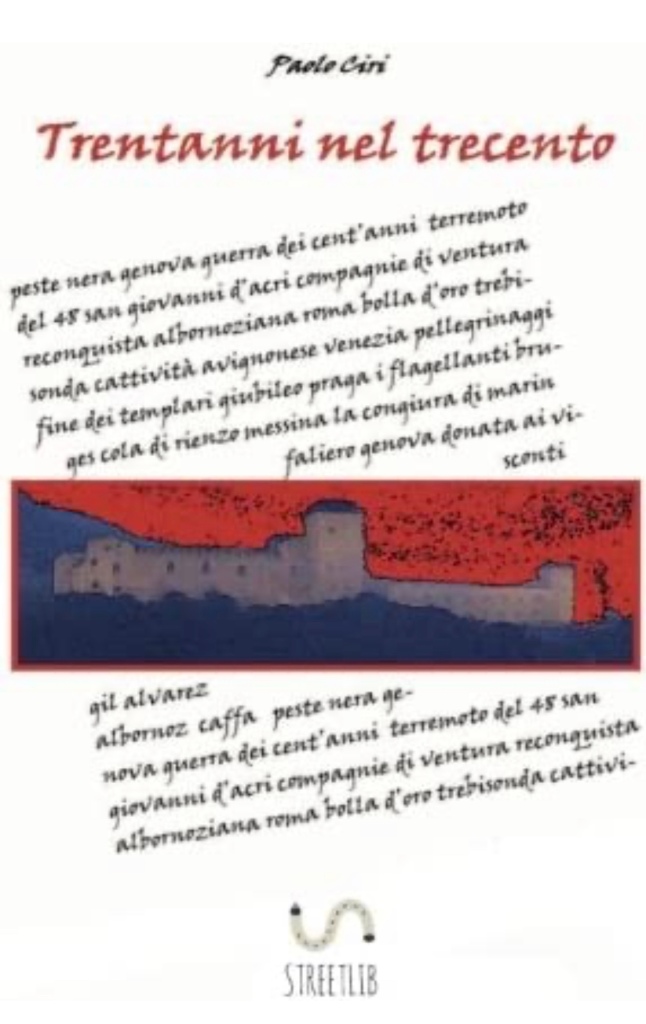 Trentanni Nel Trecento Un romanzo / saggio che descrive le vicende dei personaggi storici intrecciandole con quelle dei personaggi di fantasia. Un tentativo di ricostruire la vita medioevale per confrontarla con quella odierna e scoprire che poco è cambiato. Uno stile veloce e scarno per percorrere i trenta anni di vita del protagonista, e divagare nelle tante brevi storie degli altri personaggi. Vi troverete la caduta di San Giovanni d’Acri, la fine dei Templari, la storia dei Re maledetti, le compagnie di ventura, i flagellanti, i pellegrini, Cola di Rienzo, Gil Albornoz, Carlo Iv, la costruzione della Rocca di Spoleto, la Bolla d’Oro, la Serenissima Repubblica di Venezia, le battaglie in oriente, la guerra dei cento anni, il terremoto e la peste nera che coinvolsero tutta Europa, e molto altro, intorno alla vita di Jacquì.